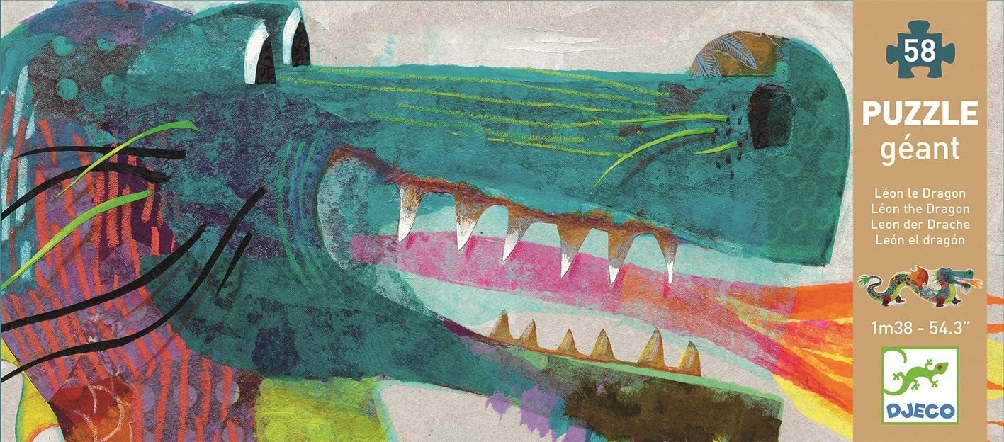 Conquer this dragon puzzle! The giant, over-4-feet long, scaly, colorful monster is made up of large pieces that are just right for little hands. Beautiful designs and fiery breath make assembly an exciting project. 58 high-quality, precision-cut pieces resist fading, creasing and peeling and come in a durable storage box.<br><br><p><em>For ages 4-7 yrs, from Djeco.</em></p>