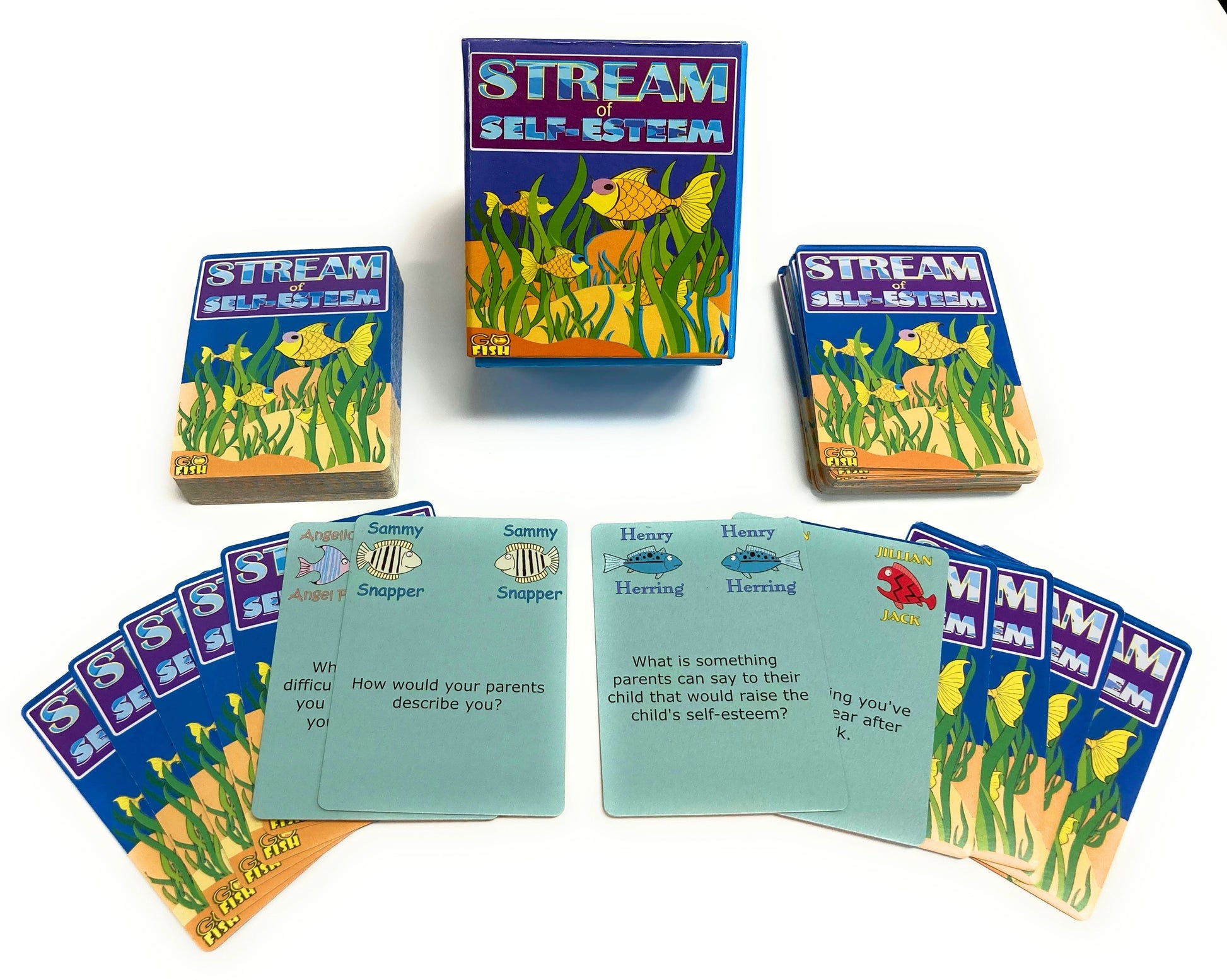 For children grades K-5. Based on the popular card game, Go Fish, this game helps players build their self-esteem by sharing their own efforts, accomplishments, and persistence. The interactive play further builds self-esteem by strengthening social and conversational skills. There are two decks of 50 cards; one for each grade level. The game differs from classic go fish in that players must answer a question before they can accept a requested card. Instead of numbers on the cards they all have fun fish names and pictures. Rules sheet and facilitator guidelines included.