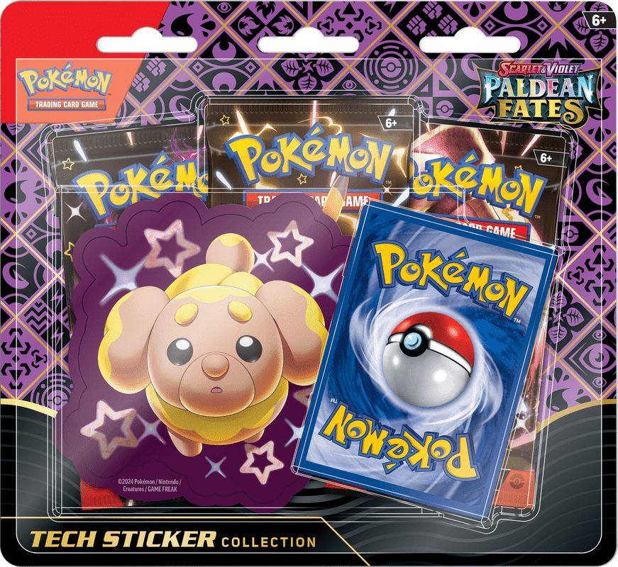 The Pokémon TCG: Scarlet & Violet—Paldean Fates Tech Sticker Collection includes: