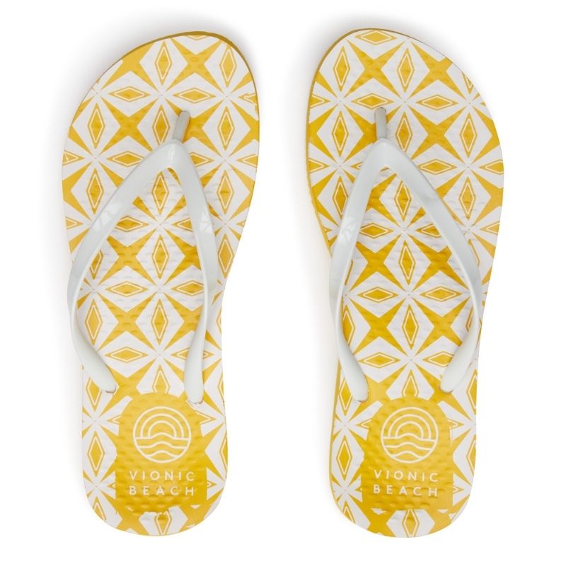 Slide into sole-soothing flip-flops for easy comfort on the beach or in town. A sleek summer classic. A low-profile injected EVA flip flop with exclusive contoured arch to promote natural alignment from the feet up. Infused supportive technology into a sleek silhouette and added bright colors and fun prints to make this classic flip flop better.