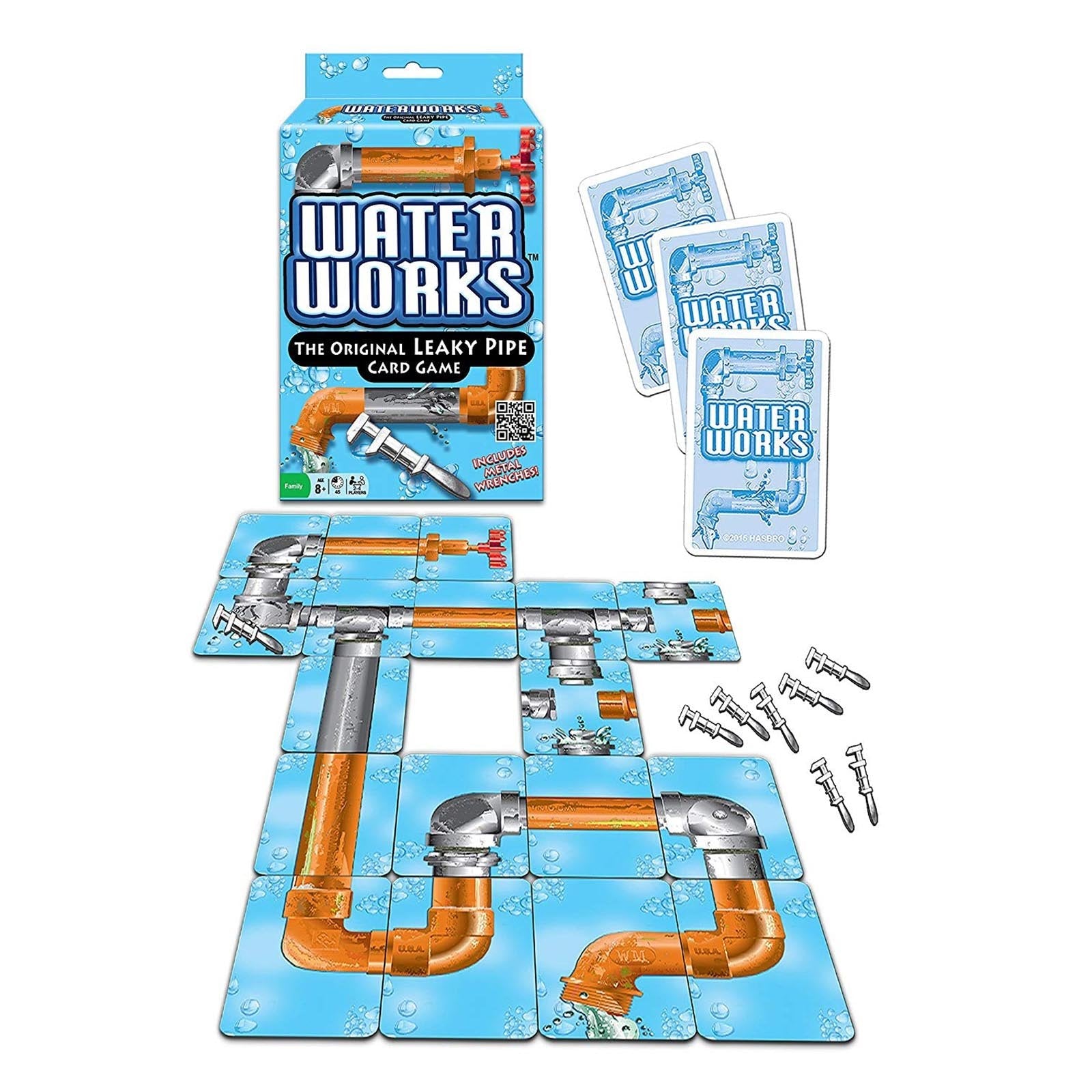 Includes 110 pipe cards, 8 metal wrench, and rules of play.